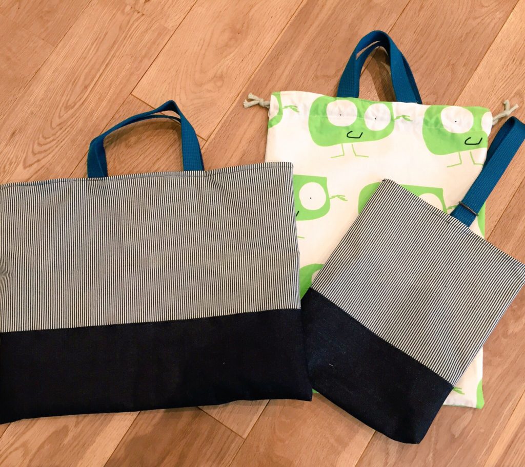 通学サブバッグと、体操服入れ、上履き入れ、歯磨きコップ巾着袋。