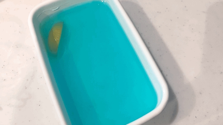 ブルーハワイのシロップとライムで香りづけしたゼリーです。これを、適当な大きさに切っていきます。